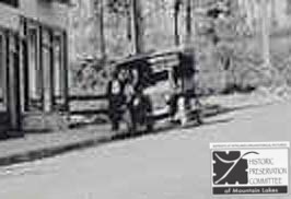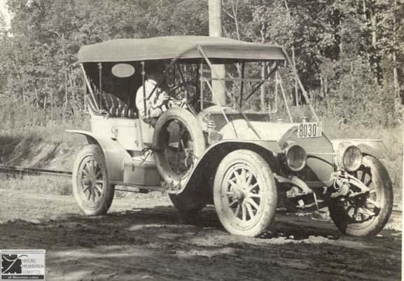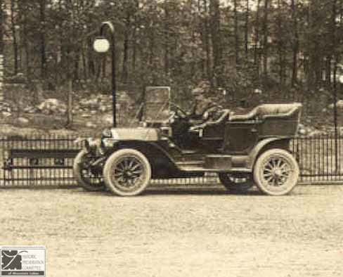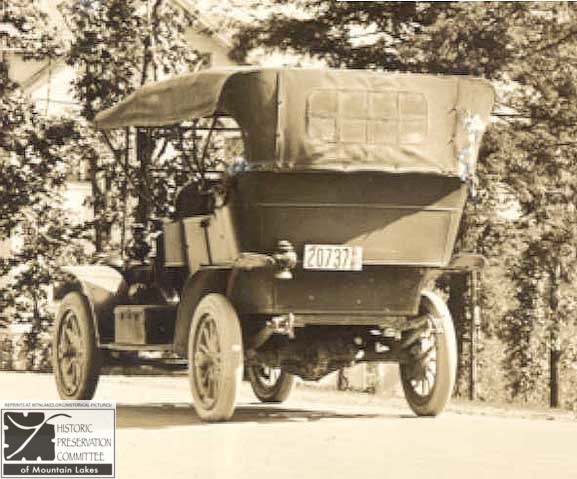 In the first days of Mountain Lakes, walking was the most common mode of transportation. Horse-drawn carriages had long since disappeared. People walked to and from the train station and to and from the stores. The trolley served for travel up and down the Boulevard and into Boonton or out to Bloomfield Avenue (now Route 46). Some people had automobiles but kept them in the city. A few of the more wealthy families owned automobiles and used them in Mountain Lakes as well. The pictures on these pages are enlargements of automobiles that appeared occasionally in the house photos. They are collected here so that they may be seen all together.
